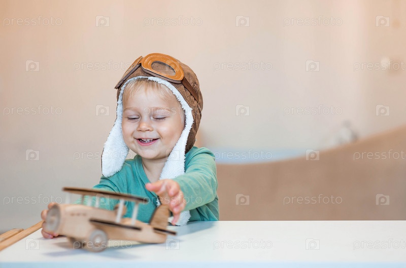 Симпатичный мальчик 2 лет в пилотской шапке играет с деревянным самолетом и конструктором логистики. Детские деревянные игрушки для развития ребенка
