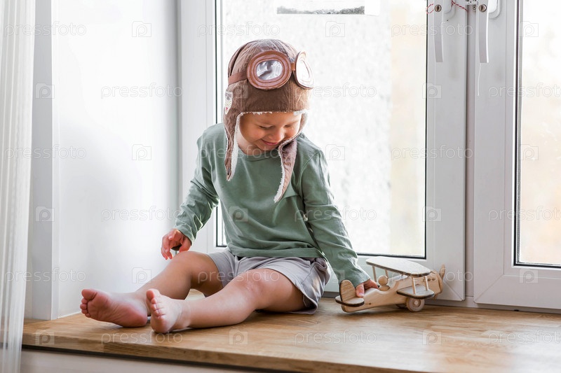 Милый 2-летний мальчик в кепке играет на подоконнике с деревянным самолетиком. Детские деревянные игрушки для развития ребенка