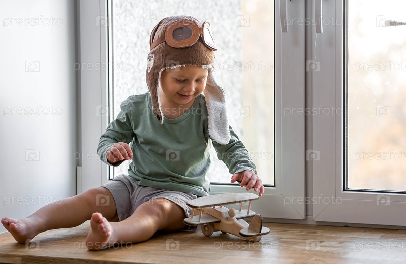 Милый 2-летний мальчик в кепке играет на подоконнике с деревянным самолетиком. Детские деревянные игрушки для развития ребенка