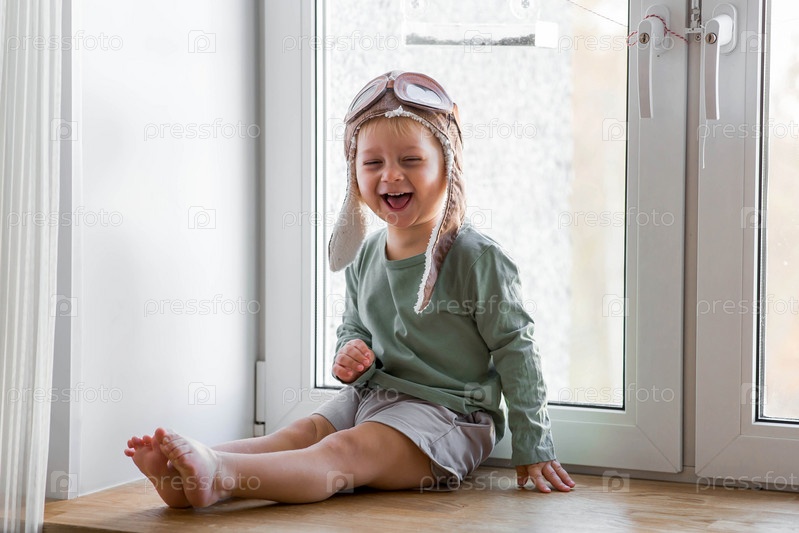 Милый 2-летний мальчик в кепке играет на подоконнике с деревянным самолетиком. Детские деревянные игрушки для развития ребенка