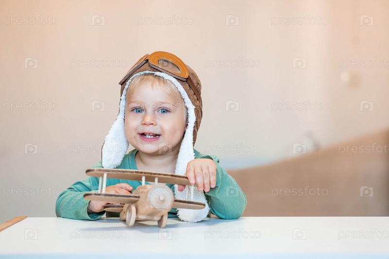 Симпатичный мальчик 2 лет в пилотской шапке играет с деревянным самолетом и конструктором логистики. Детские деревянные игрушки для развития ребенка