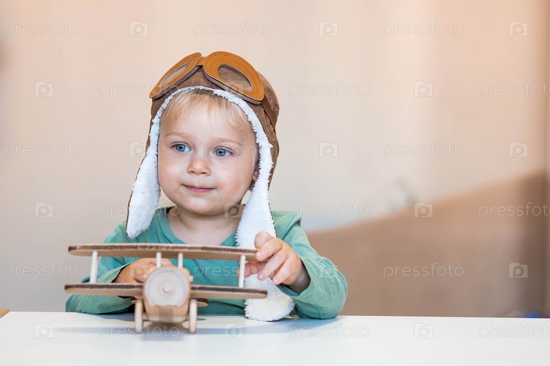 Симпатичный мальчик 2 лет в пилотской шапке играет с деревянным самолетом и конструктором логистики. Детские деревянные игрушки для развития ребенка