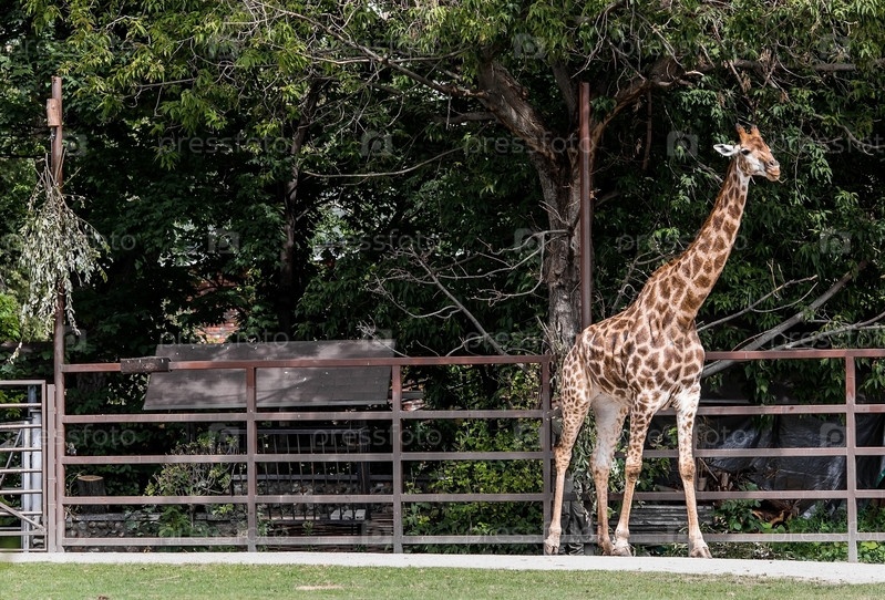 Жираф на фоне зеленых деревьев. Животное крупным планом. Московский зоопарк