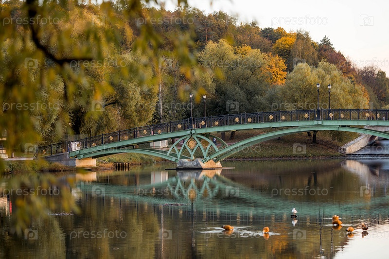 Россия. Царицынский парк в Москве осенним днем. Вид на реку и восточный арочный мост Царицынский парк — одна из главных туристических достопримечательностей Москвы