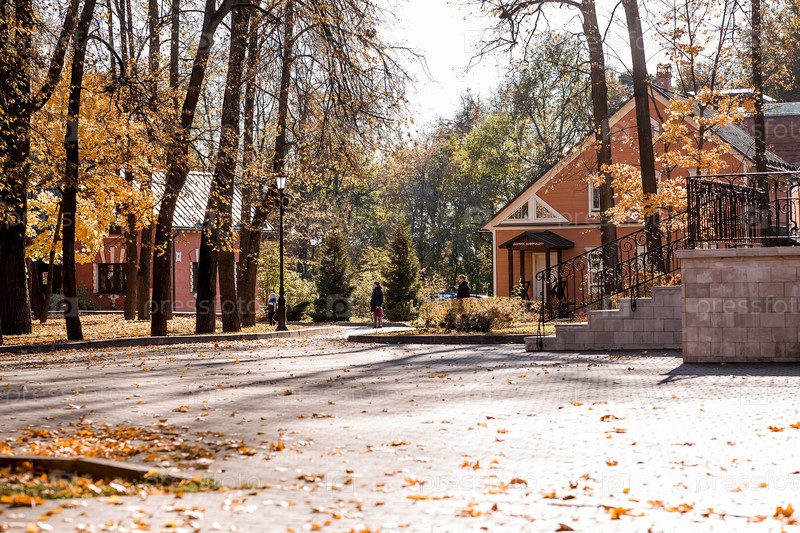 Улицы подмосковного Видного. Красивая осенняя усадьба с желтыми деревьями в солнечный осенний день. Городской пейзаж
