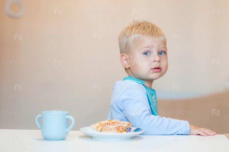 Нездоровая еда для детей. Еда. Милый двухлетний ребенок ест пиццу на обед. Фастфуд. Семья и дети