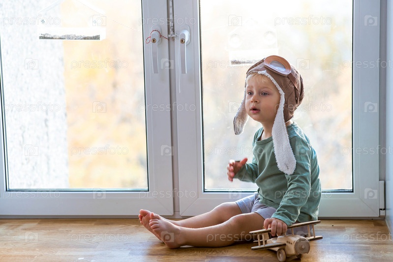 Милый 2-летний мальчик в кепке играет на подоконнике с деревянным самолетиком. Детские деревянные игрушки для развития ребенка