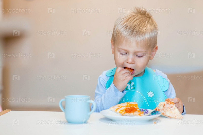 Нездоровая еда для детей. Еда. Милый двухлетний ребенок ест пиццу на обед. Фастфуд. Семья и дети