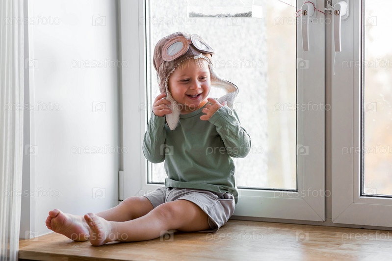Милый 2-летний мальчик в кепке играет на подоконнике с деревянным самолетиком. Детские деревянные игрушки для развития ребенка