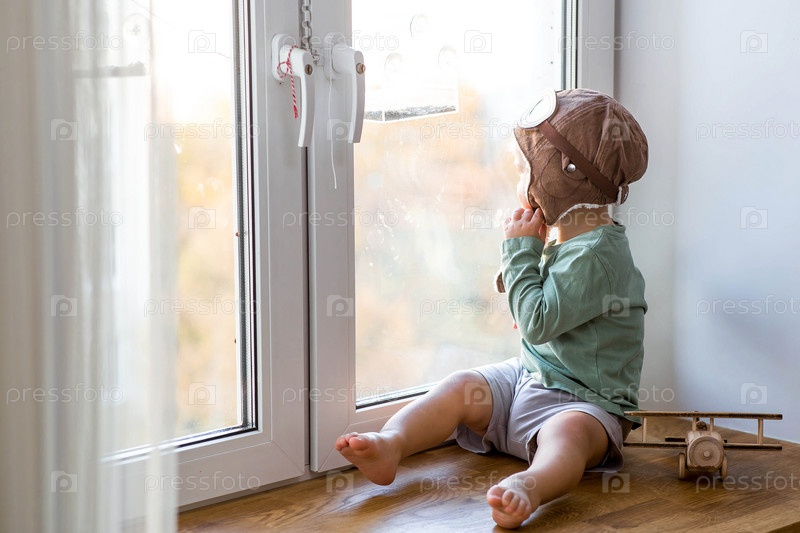Милый 2-летний мальчик в кепке играет на подоконнике с деревянным самолетиком. Детские деревянные игрушки для развития ребенка
