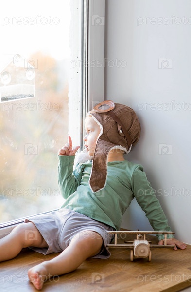 Милый 2-летний мальчик в кепке играет на подоконнике с деревянным самолетиком. Детские деревянные игрушки для развития ребенка