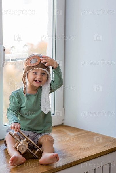 Милый 2-летний мальчик в кепке играет на подоконнике с деревянным самолетиком. Детские деревянные игрушки для развития ребенка