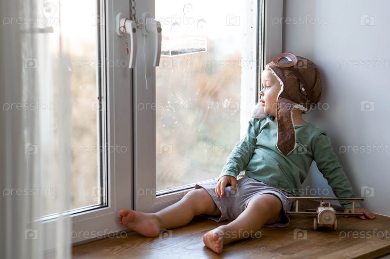 Милый 2-летний мальчик в кепке играет на подоконнике с деревянным самолетиком. Детские деревянные игрушки для развития ребенка