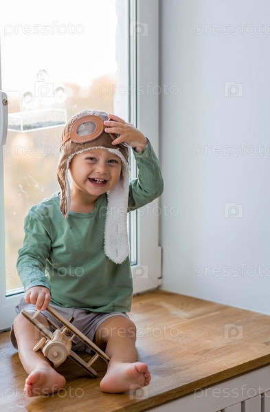 Милый 2-летний мальчик в кепке играет на подоконнике с деревянным самолетиком. Детские деревянные игрушки для развития ребенка