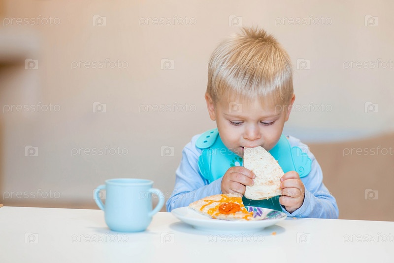 Нездоровая еда для детей. Еда. Милый двухлетний ребенок ест пиццу на обед. Фастфуд. Семья и дети