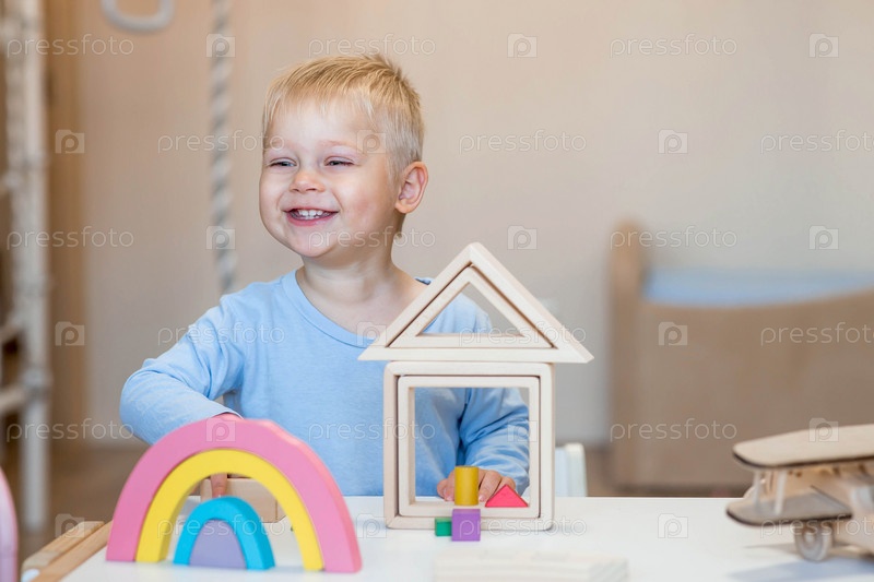 Мальчик 2 лет играет в развивающий конструктор логистика. Детские деревянные игрушки. Монтессори для развития ребенка