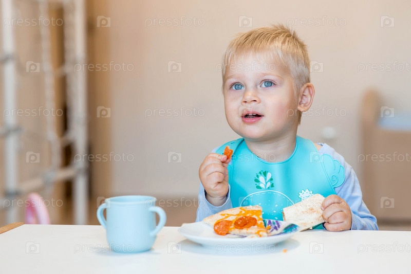 Нездоровая еда для детей. Еда. Милый двухлетний ребенок ест пиццу на обед. Фастфуд. Семья и дети