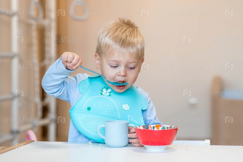 Детское питание. Еда. Кормление ребенка. Милый ребенок ест сам ложкой. Здоровое питание. Семья и дети