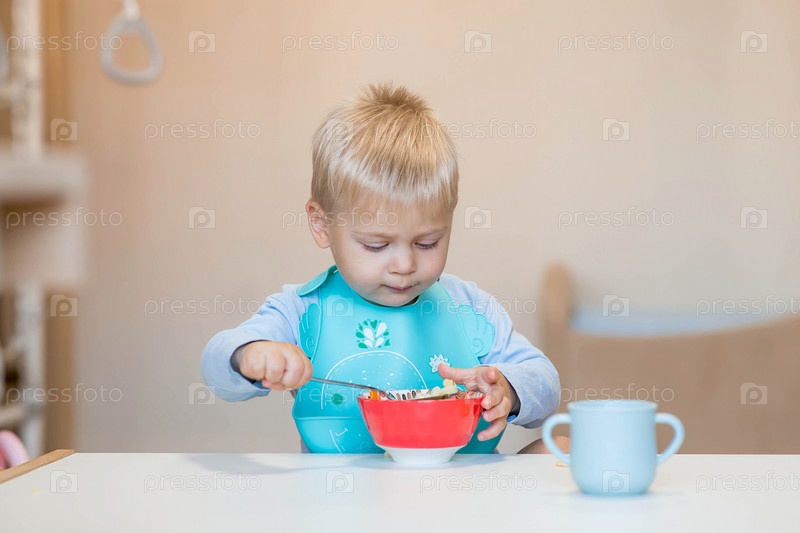 Детское питание. Еда. Кормление ребенка. Милый ребенок ест сам ложкой. Здоровое питание. Семья и дети