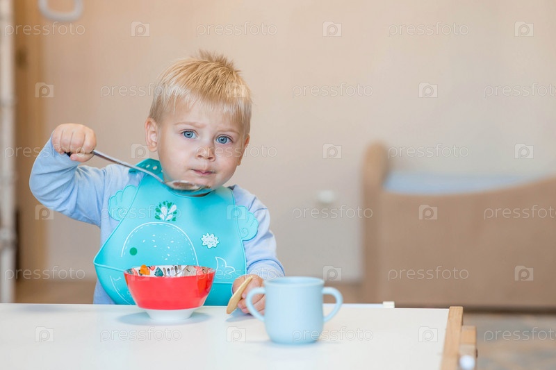 Детское питание. Еда. Кормление ребенка. Милый ребенок ест сам ложкой. Здоровое питание. Семья и дети