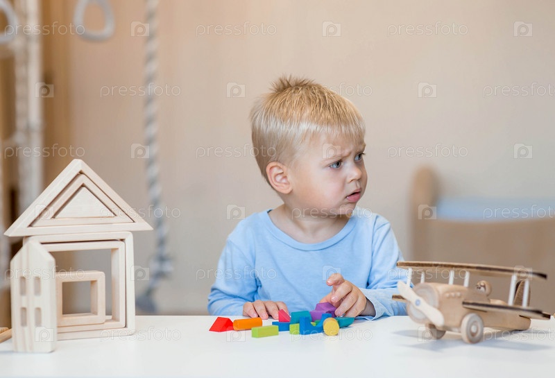 Мальчик 2 лет играет в развивающий конструктор логистика. Детские деревянные игрушки. Монтессори для развития ребенка