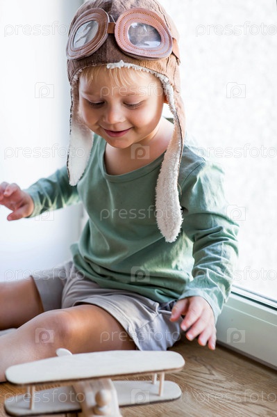 Милый 2-летний мальчик в кепке играет на подоконнике с деревянным самолетиком. Детские деревянные игрушки для развития ребенка
