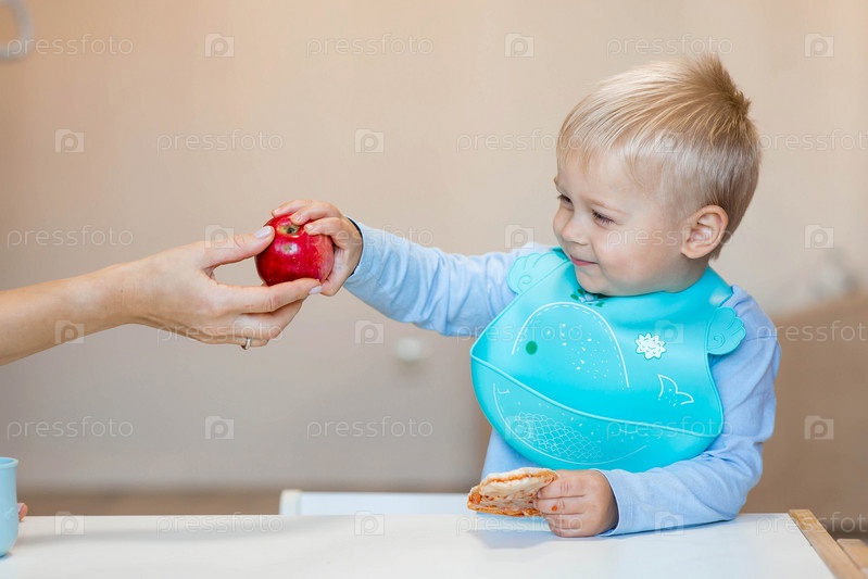 Детское питание. Еда. Кормление ребенка. Милый ребенок ест пиццу и яблоко. Выбор. Здоровая и нездоровая еда. Свежие фрукты и фастфуд