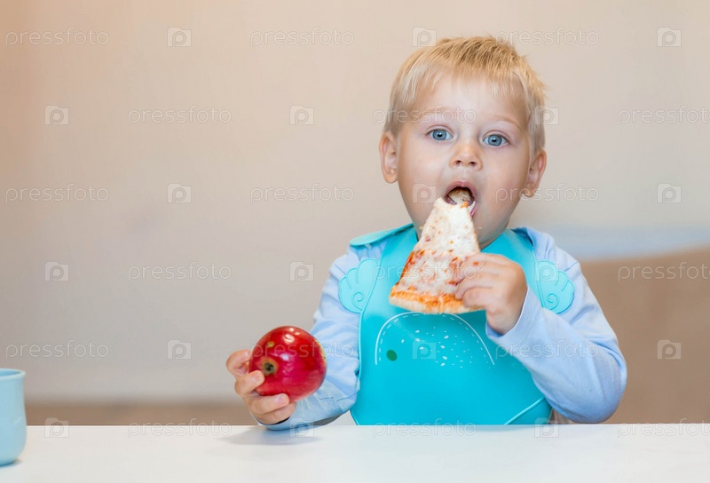 Детское питание. Еда. Кормление ребенка. Милый ребенок ест пиццу и яблоко. Выбор. Здоровая и нездоровая еда. Свежие фрукты и фастфуд