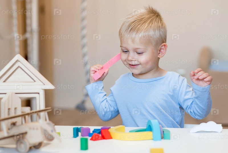 Мальчик 2 лет играет в развивающий конструктор логистика. Детские деревянные игрушки. Монтессори для развития ребенка