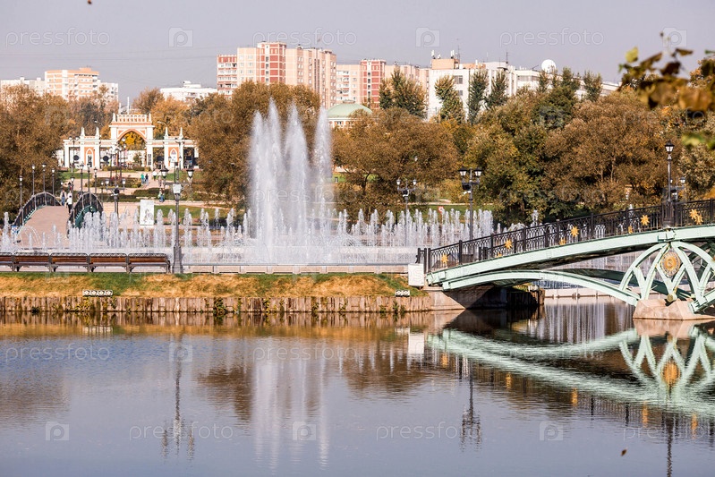 Россия. Царицынский парк в Москве осенним днем. Вид на реку и восточный арочный мост Царицынский парк — одна из главных туристических достопримечательностей Москвы