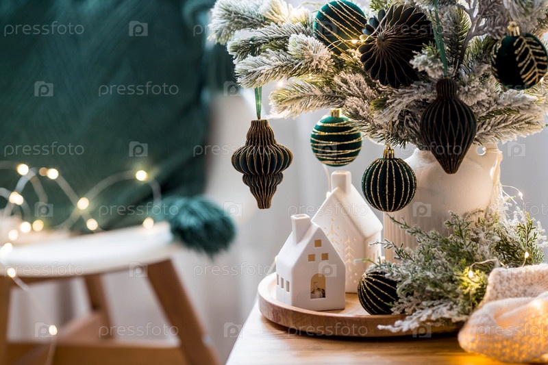 Букет елок, плед, скандинавские белые домики и бумажные игрушки на деревянном столе в домашнем интерьере гостиной. Уютная концепция для праздничного оформления дома
