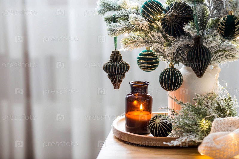 Концепция Нового года и Рождества. В холодную погоду в доме тепло. Елочные игрушки из бумаги на еловых ветках и свеча на журнальном столике в интерьере гостиной