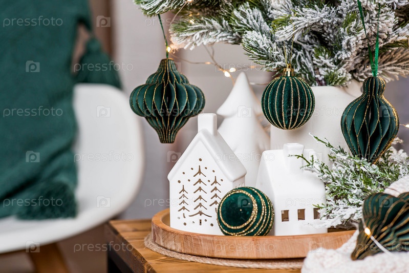 Букет елок, плед, скандинавские белые домики и бумажные игрушки на деревянном столе в домашнем интерьере гостиной. Уютная концепция для праздничного оформления дома