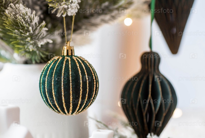 Стильные бархатные и бумажные елочные игрушки в скандинавском стиле на еловых ветках. Зеленые тона. Концепция стильного нового года и Рождества 2025