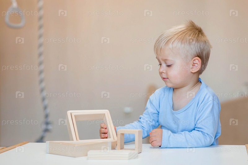 Мальчик 2 лет играет в развивающий конструктор логистика. Детские деревянные игрушки. Монтессори для развития ребенка