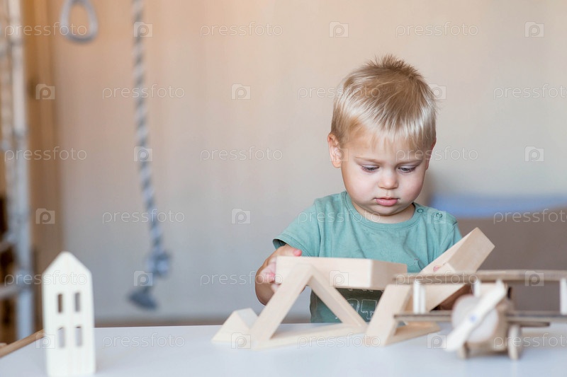 Мальчик 2 лет играет в развивающий конструктор логистика. Детские деревянные игрушки. Монтессори для развития ребенка