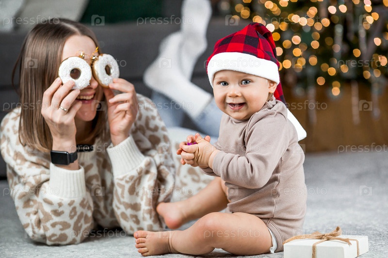 Красивый маленький светловолосый мальчик 1 года сидит с мамой на фоне рождественской елки. Концепция празднования Рождества и Нового года