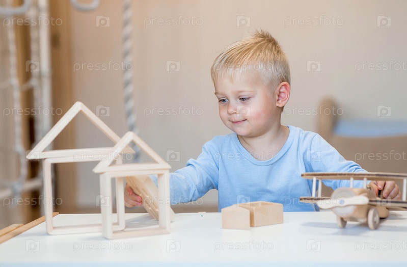 Мальчик 2 лет играет в развивающий конструктор логистика. Детские деревянные игрушки. Монтессори для развития ребенка