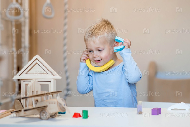 Мальчик 2 лет играет в развивающий конструктор логистика. Детские деревянные игрушки. Монтессори для развития ребенка