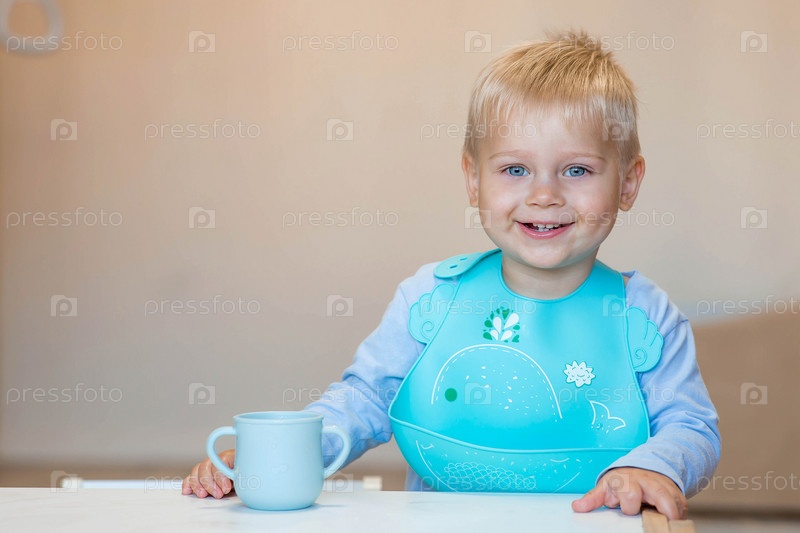 Детское питание. Первый прием пищи. Кормление ребенка. Малыш пьет из синей кружки. Баланс питья