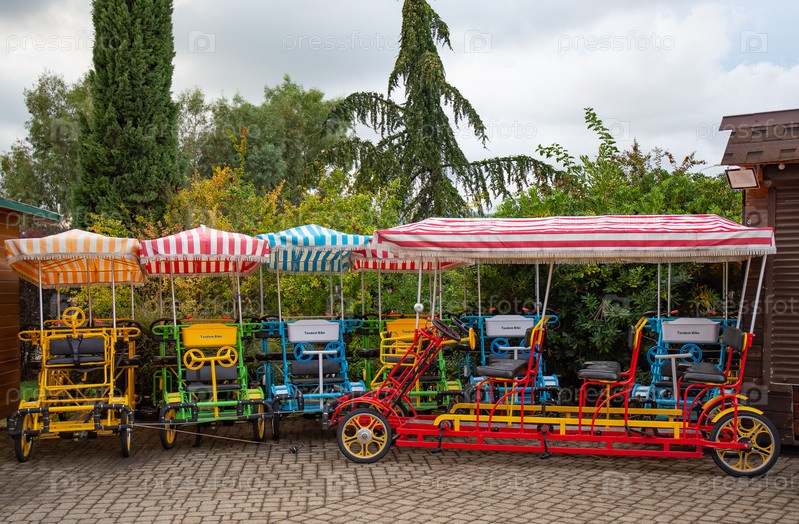 Рикша припаркована на улице города. Тук-тук — популярная туристическая достопримечательность в Сочи-парке в Адлере летом