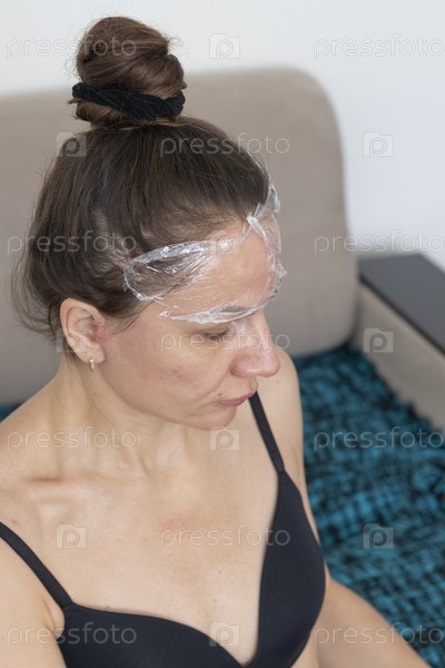 Женщина обматывает лицо и шею пищевой пленкой в качестве процедуры по уходу за кожей. Косметика