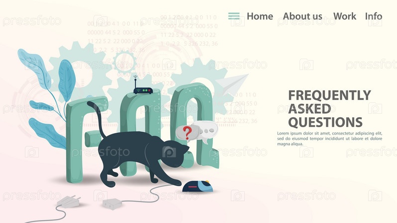 Векторная иллюстрация Шаблон целевой страницы для веб-страницы или приложения Черный кот стоит рядом с заглавными буквами FAQ