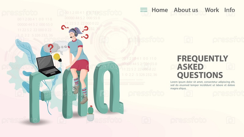 Векторальная иллюстрация FAQ Шаблон целевой страницы для веб-страницы или приложения Девушка в наушниках сидит на заглавных буквах и отвечает на вопросы перед ноутбуком