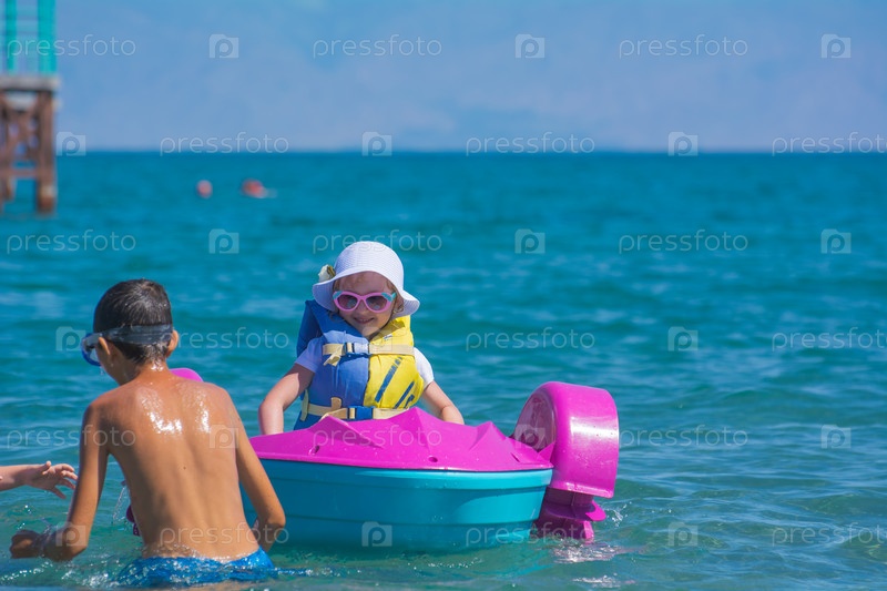Ребенок 5-8 лет катается по морю на детской водной лодке