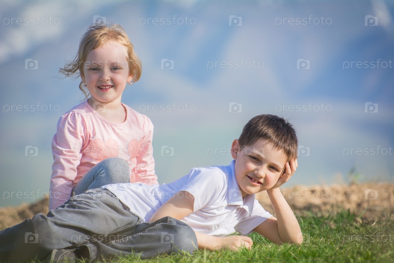 Дети, брат и сестра лежат на лужайке
