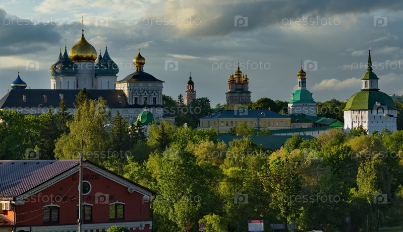 Сергиев Посад. Россия. 07 июня 2022 года. Вид на позолоченные купола православных церквей Троице-Сергиевой лавры. Знаменитый монастырь был основан в 1337 году