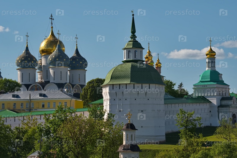 Сергиев Посад. Россия. 07 июня 2022 года. Вид на позолоченные купола православных церквей Троице-Сергиевой лавры. Знаменитый монастырь был основан в 1337 году
