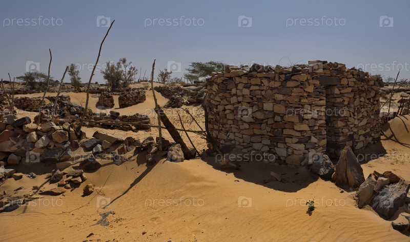 Западная Африка. Мавритания. Здания из песка и камня в деревне на юге пустыни Сахара, недалеко от оазиса Терджит