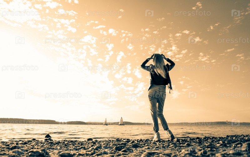 Безмятежный пляжный закат с женщиной, наслаждающейся красотой природы